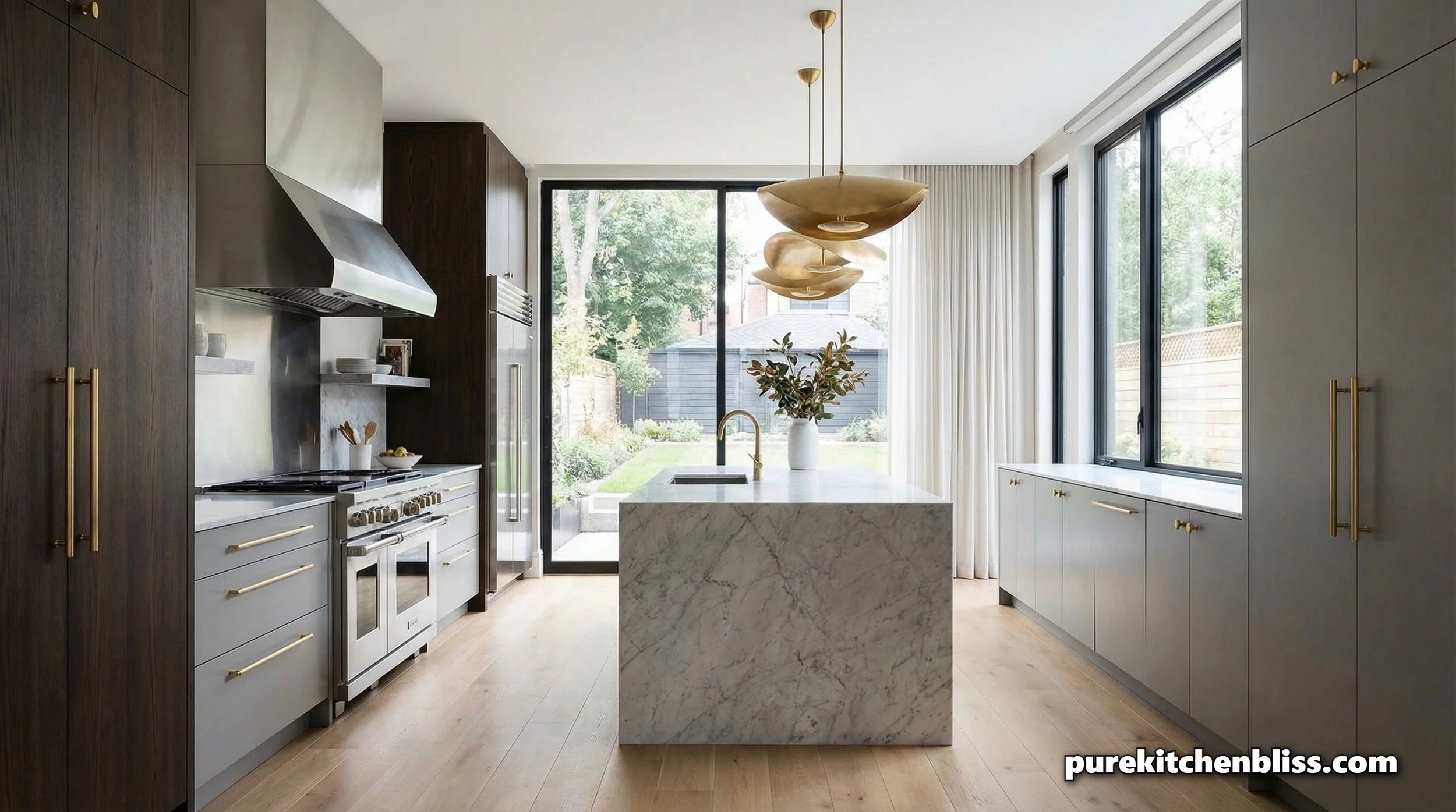 30% Accent Metal: Use Gold or Brass for your "touch points"—cabinet pulls, light fixtures, and the kitchen faucet.