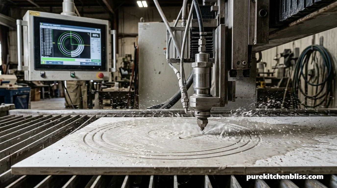 The Underside Mill: The fabricator must use a CNC machine (as shown in Image 2) to "thin out" the stone from the underside, leaving only a few millimeters of material where the coils will sit. This ensures the magnetic field is strong enough to reach the pan.