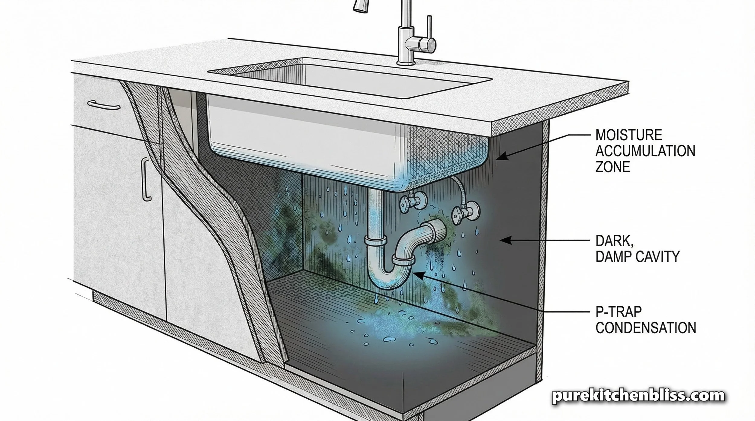 The cabinet beneath your sink is the #1 mold hot spot in the home. It is dark, unventilated, and subject to "Micro-Leaks", tiny drips from the faucet or the P-trap that don't flood the cabinet but keep the wood floor consistently damp.