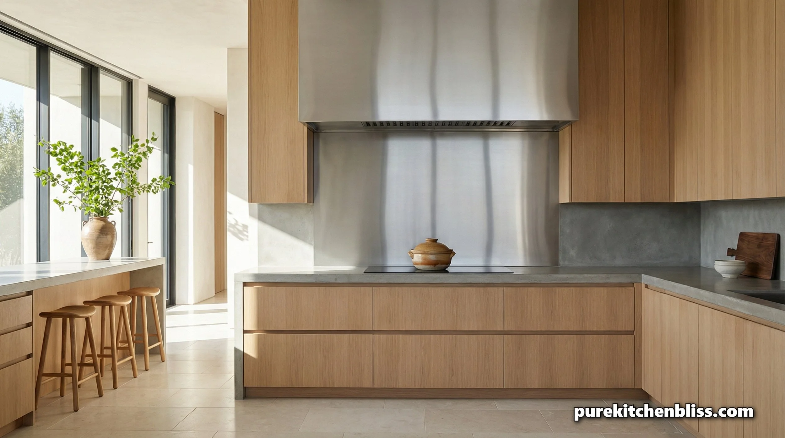Modern minimalist kitchen featuring a stainless steel range hood and a clean white induction cooktop in a bright, airy sanctuary-style home.