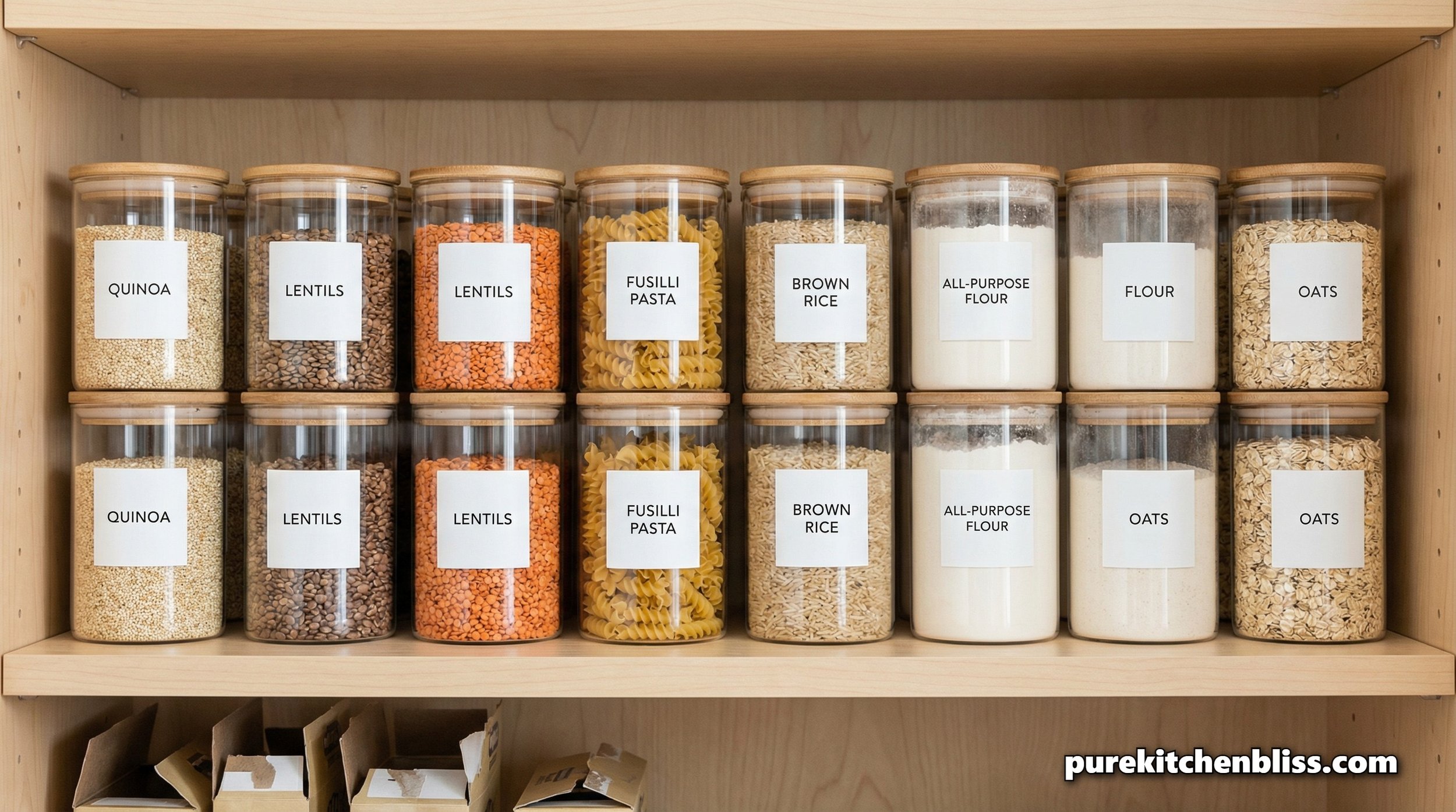 The Hack: Decant dry goods into uniform, stackable glass containers. It reduces the physical footprint of your food by up to 30% and allows for an instant "visual check." This prevents "Double Buying" that clutters up a family pantry.